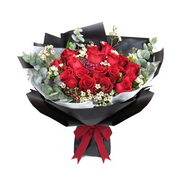 Red roses and white filler with eucalyptus leaves in stylish black wrapping